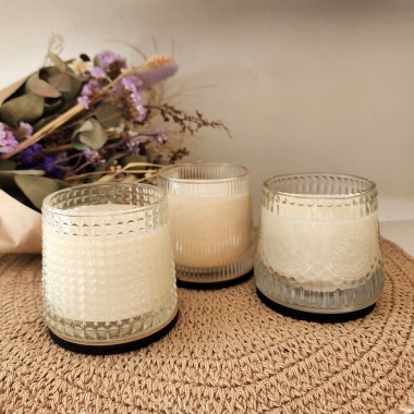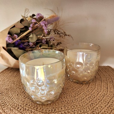 Vela de cera de soja en vaso de vidrio tornasol.